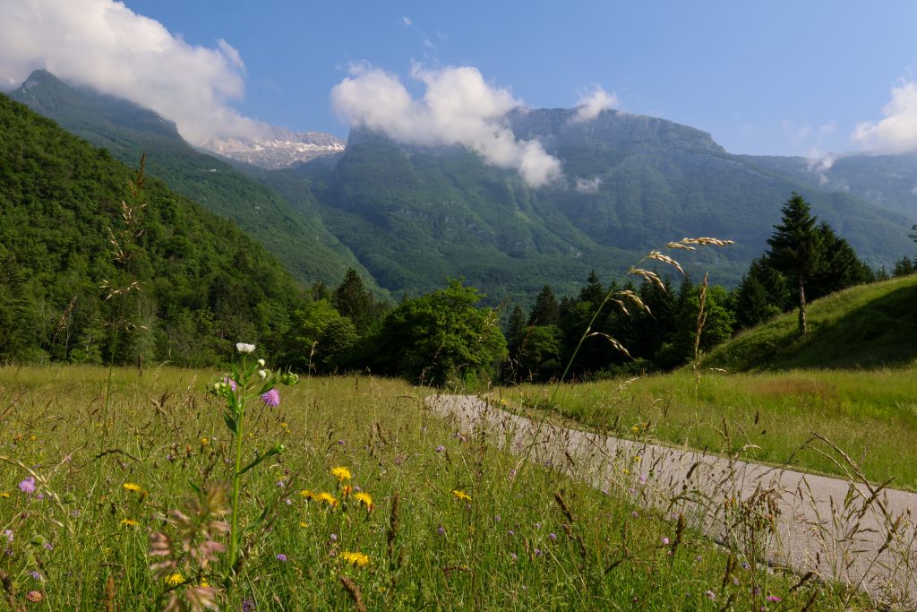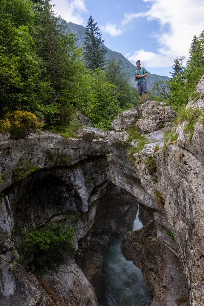 We started walking amongst the trees that lined the banks of the river, occasionally emerging to look down on the water rushing through. In this area, the river crashes passed stone walls that it has carved into curves, caves and tunnels. The water flows fast through the narrow rocks and only occasionally can you see the bright blue nature of the river. The rest of the time the water is white from the vigorous flow. Further down towards Kamp Soca and Kamp Klin the river widens and depends into pools and you can swim, jumping from the boulders on the sides. But the weather wasn’t on our side for swimming again today.