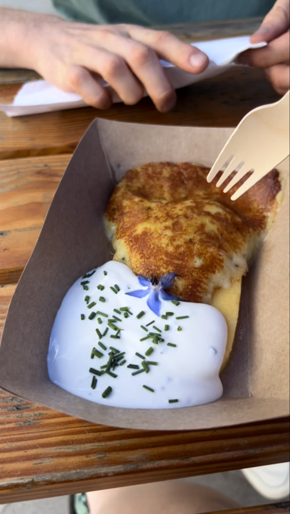 From Virje waterfall it was a short drive into Bovec. Bovec is supposed to be the ‘hub’ for outdoor adventure activities in Slovenia. You can paraglide, go canyoneering, white water rafting. But we were here for one thing: Frika. The Soča valley is home to this dish made from potatoes and Tolminc cheese. It’s like very cheesy, lumpy mashed potato, fried into a patty and served over a block of polenta. We got it from a food stall called Bovec Kitchen, and they served it with a chive yoghurt which freshened it up. We shared one for €7 but probably could have eaten more if we thought our hearts could take it. We sat in the square in Bovec and had a hibiscus iced tea and a beer while we ate.