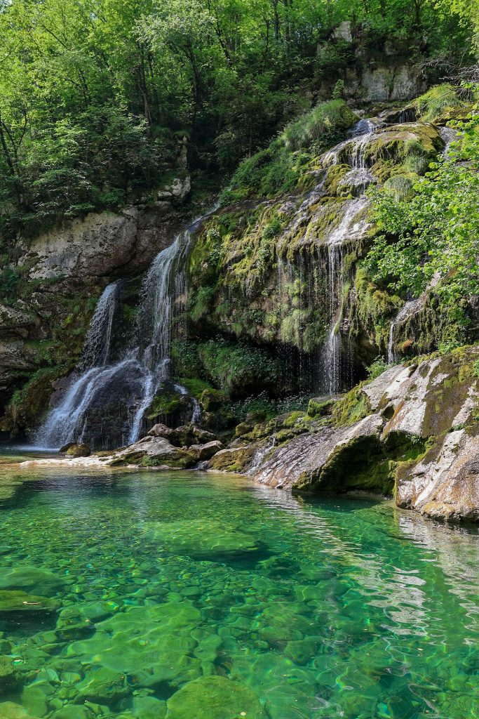 Virje is a gentle fall, it’s not very fast or tall. The water tumbles over ledges and drips down mossy growths, in front of flowers growing in nooks. It falls down into a bright green pool, so clear that it looks much shallower than it is. Nobody was swimming, and when we put our hands in the water we could see why – it was painfully cold. But the sun was shining and we had brought our gear, so we started to get changed as we sat on the rocks surrounding the waterfall. As we did, a group of young guys started jumping from an elevated rock, crashing into the green pool and rising up with hoots to express how cold the water was.
